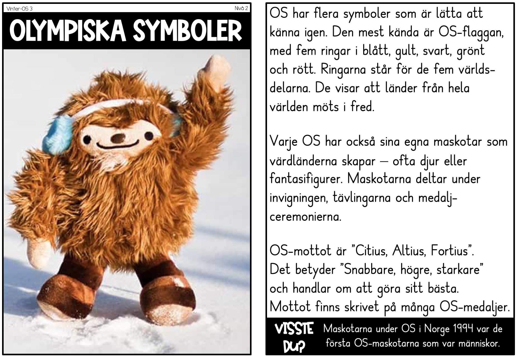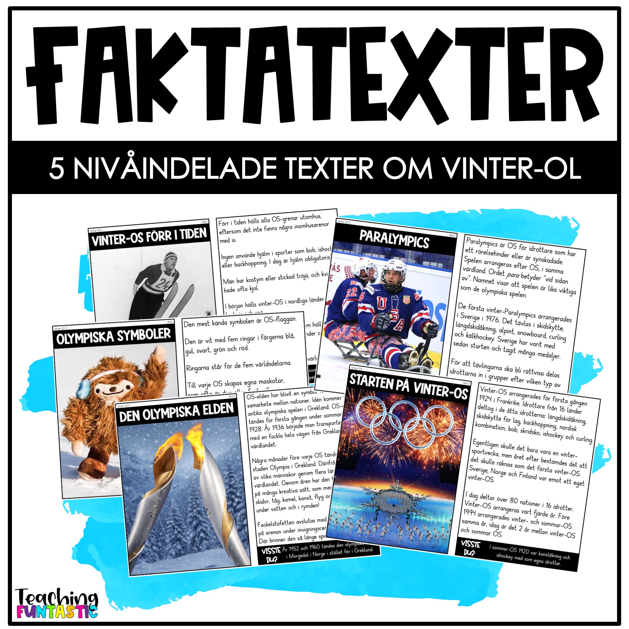 Varje tema med fem texter finns i tre nivåer. På nivå 1 är språket mycket enkelt, med korta meningar och få ämnesord. Det ger en trygg ingång till faktatexter för elever som behöver lättlästa texter – något som annars kan vara svårt att hitta. Nivå 2 bygger vidare med korta stycken och tydlig struktur, medan nivå 3 ger mer informationstäta texter med längre meningar och svårare ordförråd. Tillsammans gör nivåerna det möjligt att anpassa läsningen utan att behöva använda helt olika texter i klassen.