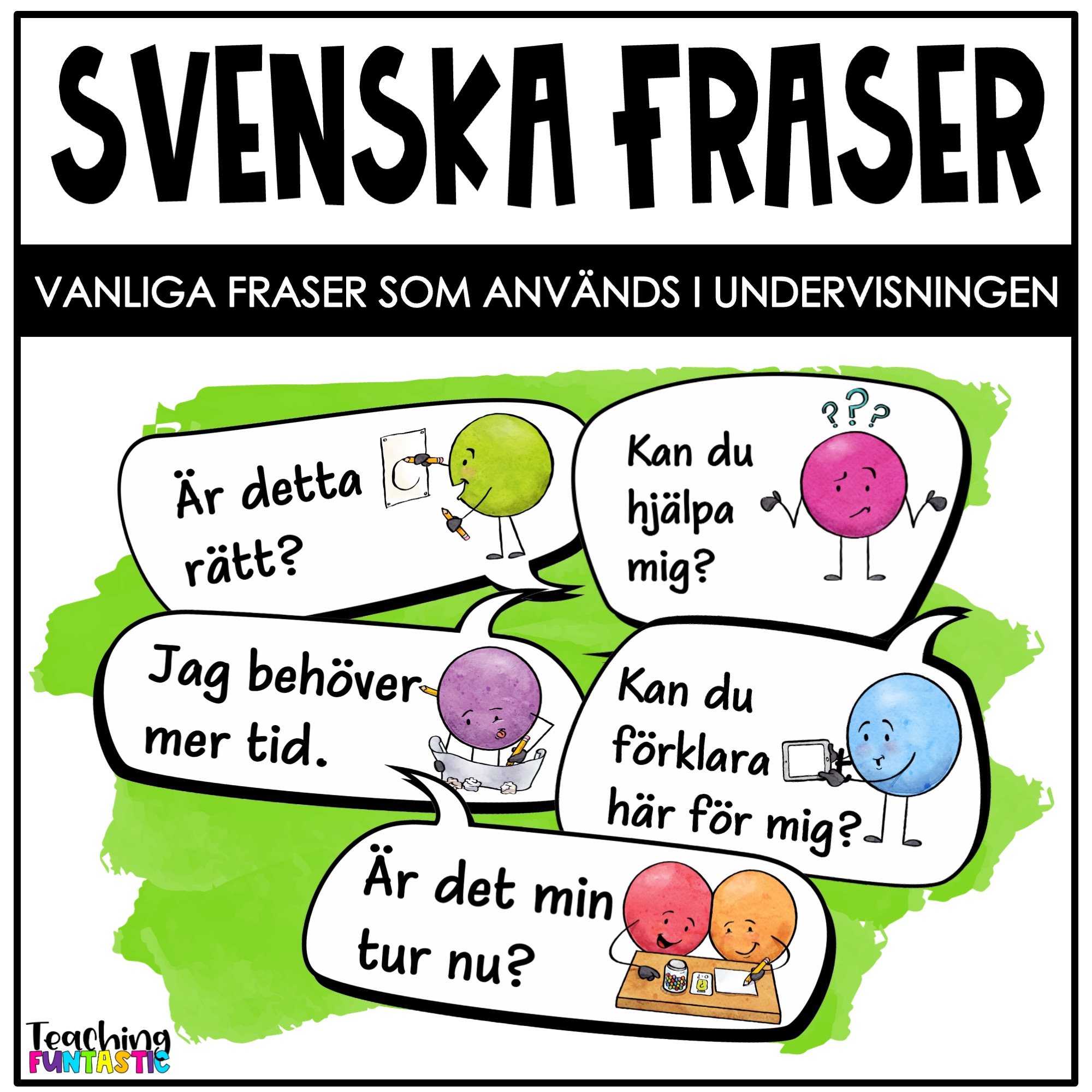 Ge eleverna ett praktiskt språkligt stöd i vardagen! Det här setet innehåller fraser som används ofta i skolan – till exempel ”Kan du hjälpa mig?”, ”Får jag gå på toaletten?”, ”Vad betyder det?” och ”Tack så mycket!”.
